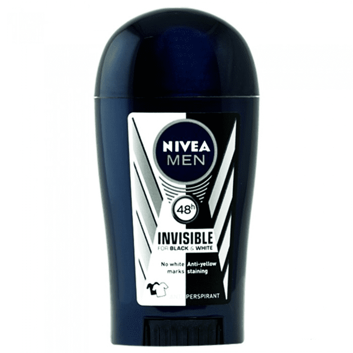 NIVEA Men Deo Invisible for Black & White stick 40ml The new Deo developed with textile experts to offer you powerful anti-perspirant protection without risks of white marks and with reduction of yellow stains. For your black tops to stay black and the white shirts to stay white. The unique formula protects you 48h non-stop against perspiration and helps to maintain the original color of your clothes. The transparent protection doesn’t leave traces.